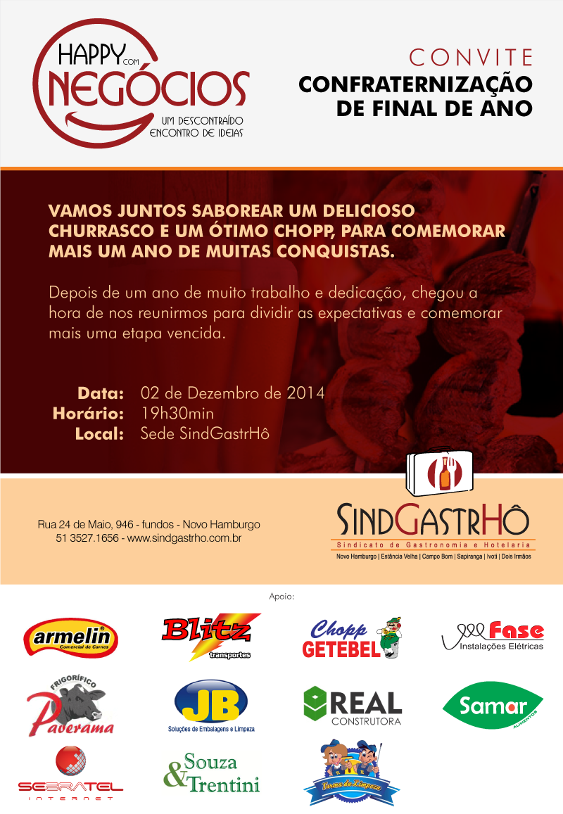 A confraternização oficial de final de ano do SindGastrHô ocorrerá nesta terça-feira (02.12). A sede do sindicato receberá associados, fornecedores, parceiros e colaboradores para celebrar mais um ano que vai chegando ao seu final. O cardápio da noite terá churrasco e chope gelado. A confraternização está programada para ter início às 19h30.
