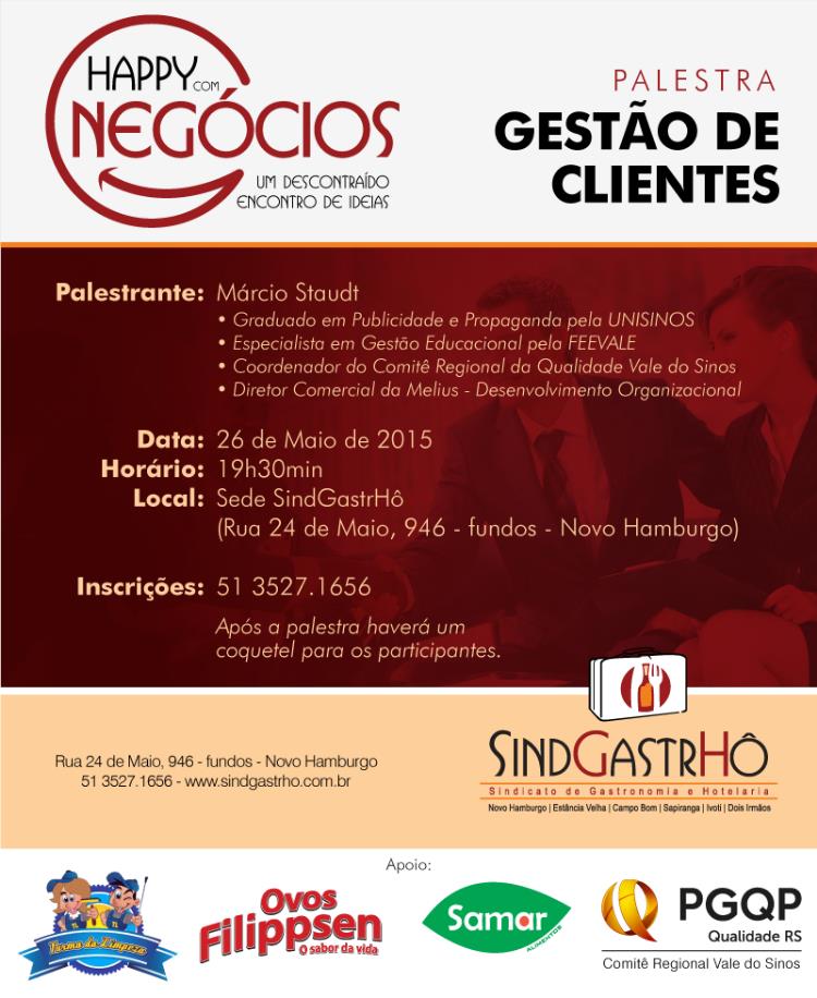 - Palestra Happy de Negócios: 28 de Julho, às 19h30min - Sede SindGastrHô - 24 de Mario, 946, Novo Hamburgo - RS