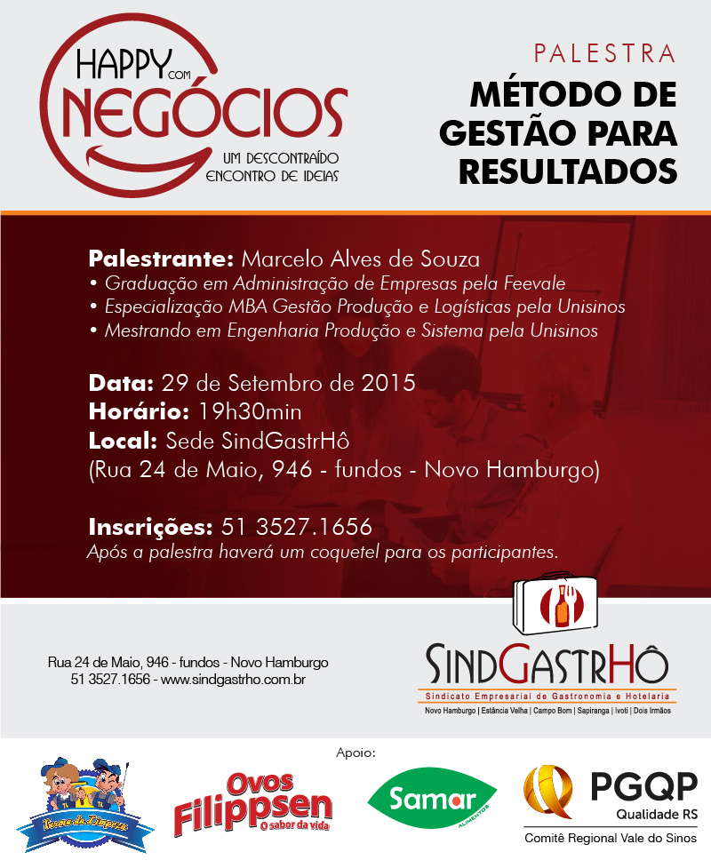 - Palestra Happy de Negócios: 28 de Julho, às 19h30min - Sede SindGastrHô - 24 de Mario, 946, Novo Hamburgo - RS