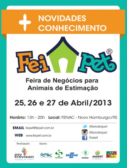 A 1a Feira do Segmento PET na região Sul do Brasil - FEIPET, será realizada na Fenac, em Novo Hamburgo – RS, nos dias 25, 26 e 27 Abril de 2013. Com o propósito de trazer produtos, equipamentos e novidades em serviço aos comerciantes de produtos PET.