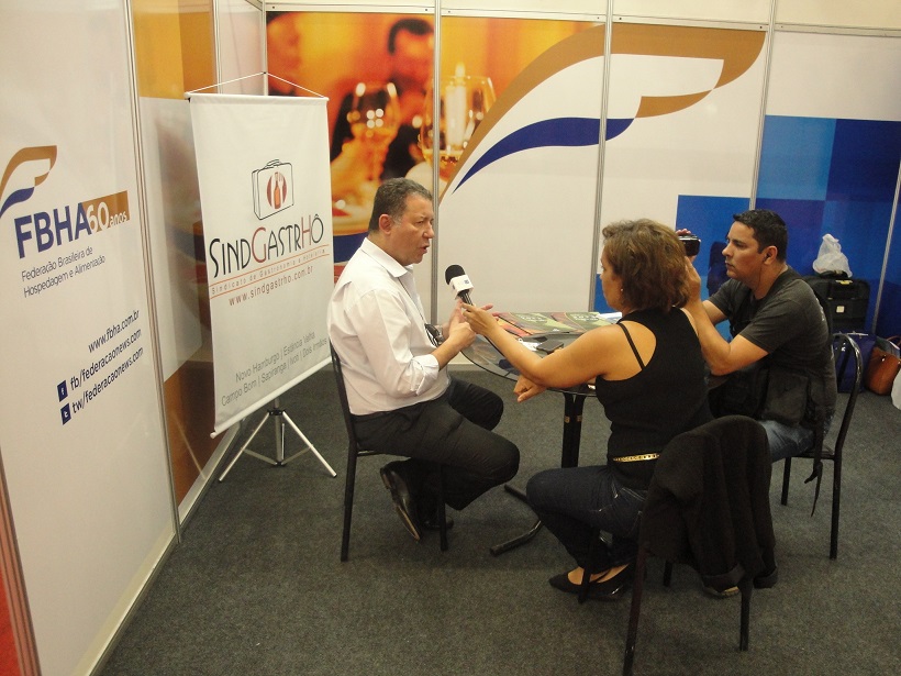 O espaço institucional também foi ponto de encontro de empresários do trade turístico, abrigou reuniões e receptivo para entrevistas realizadas pela imprensa. No registro fotográfico, o presidente da FBHA, Alexandre Sampaio, concede entrevista para a WebTV do Jornal NH.