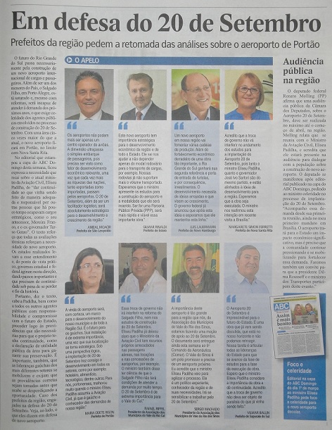A edição de 5 de março de 2015 do Jornal NH trouxe reportagem de página inteira com o título “Em defesa do 20 de Setembro”. No texto, oito prefeitos da região pedem a retomada das análises sobre o novo aeroporto internacional em Portão. Foram entrevistados Anibal Moacir (São Leopoldo), Gilmar Rinaldi (Esteio), Luis Lauermann (Novo Hamburgo), Margarete Simon Ferreti (Nova Santa Rita), Maria Odete Rigon (Portão), Rafael Riffel (Associação dos Municípios do Vale do Caí), Sérgio Machado (Associação dos Municiípios do Vale do Rio dos Sinos) e Vilmar Ballin (Sapucaia do Sul).