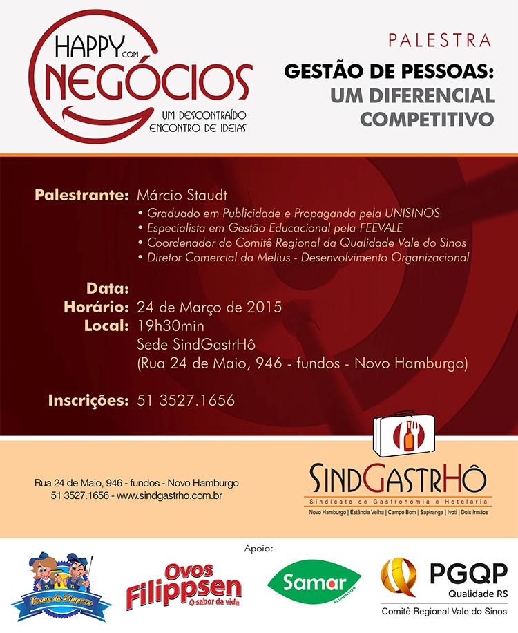 A temporada 2015 do Happy com Negócios terá segunda edição na terça-feira (24/03). O evento, promovido pelo SindGastrHô, terá como tema “Gestão de Pessoas – Um diferencial competitivo”. O convidado é Márcio Staudt, graduado em Publicidade e Propaganda pela Universidade Unisinos, com Especialidade em Gestão Educacional pela Feevale. O encontro terá início às 19h30, na sede do SindGastrHô. Inscrições pelo telefone (51) 3527.1656.