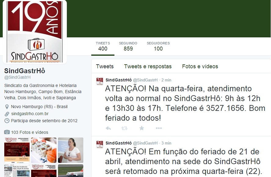 Em relação ao Twitter, a conta foi criada em 2012, mas ficou desativada. No ano passado, o trabalho de divulgação foi retomado e agora, em abril de 2015, já alcançou a marca de 100 seguidores. São políticos, jornalistas, associados, entidades, empresas dos setores de turismo, hotelaria e gastronomia, entre outros, que recebem notícias do SindGastrHô. Para seguir a conta, basta seguir a conta @SindGastrH. As notícias são atualizadas durante a semana pela assessoria de imprensa.
