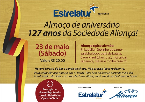 O almoço alemão em comemoração aos 127 anos da Sociedade Aliança é aberto à comunidade, mas como venda limitada de cartões. O valor do cartão é R$ 20,00 e podem ser adquiridos na secretaria do clube ou pele telefone 3527.3240. O patrocínio é da agência de viagens Estrelatur.